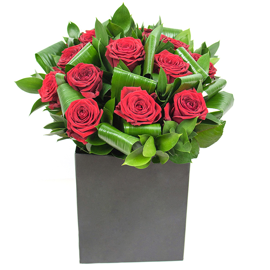 Our red rose bouquet is a symphony of beauty, featuring vibrant red roses, lush aspidistra leaves, and ruscus. This arrangement brings elegance and harmony to any occasion.
