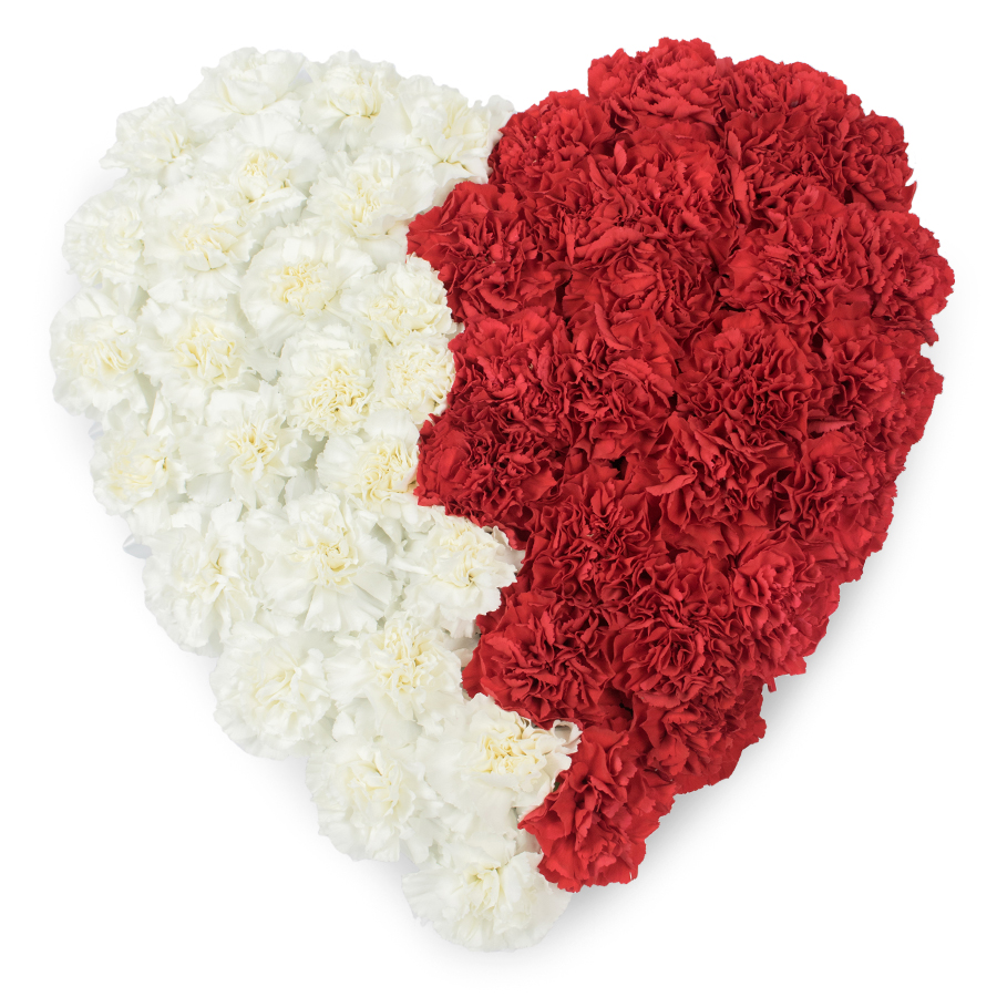 Illuminate your sentiments with our radiant heart-shaped bouquet featuring a vibrant mix of white and red carnations. Each bloom is hand-selected to ensure freshness and enduring beauty.